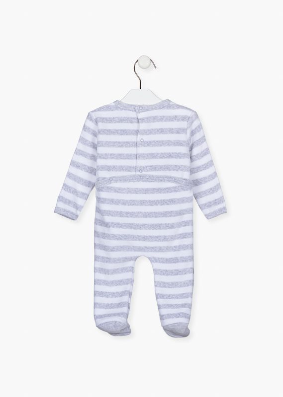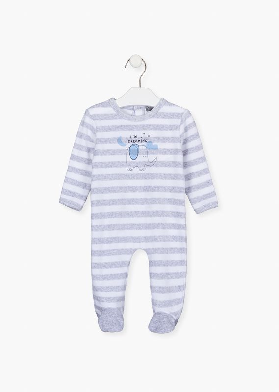 Pijama de rayas con elefante para bebé niño. Pijama de terciopelo con estampado en el delantero. Cuello redondo. Cierre trasero con corchetes. Con pies. Presentado en bolsa de tela. Disponible en gris y celeste.