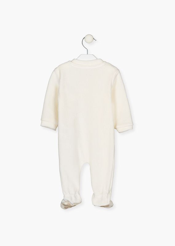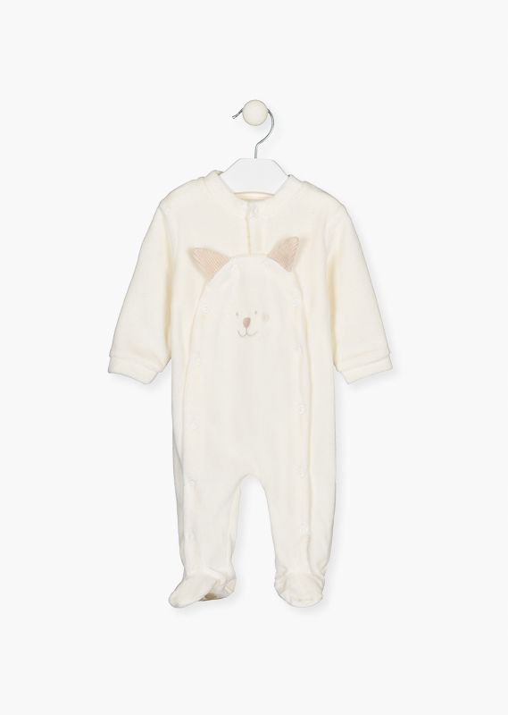 Pijama de terciopelo con apertura delantera para recién nacido. Pijama cuello caja y manga larga con doble abertura en el delantero. Con parches imitando orejas de animal. Con huella estampada antideslizante en la suela. Presentado en bolsa de tela. Disponible en crudo, rosa y celeste.