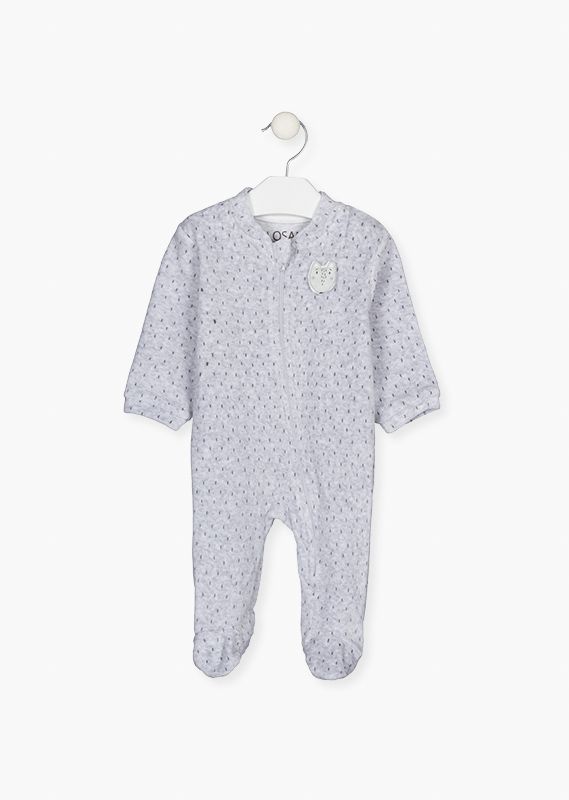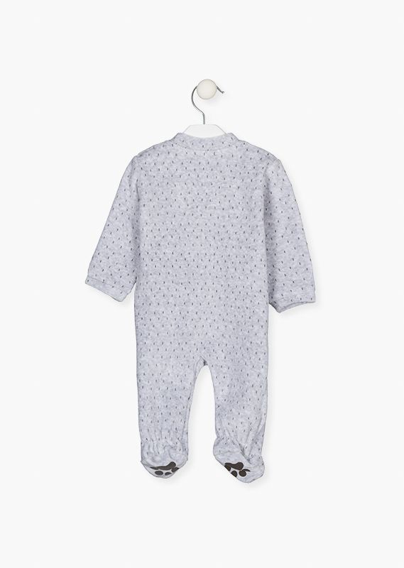 Pijama de terciopelo con cremallera para recién nacido. Pijama estampado con parche de carita de animal en el pecho. Con abertura delantera completa con cremallera. Con huella estampada antideslizante en la suela. Presentado en bolsa de tela. Disponible en rosa y gris.