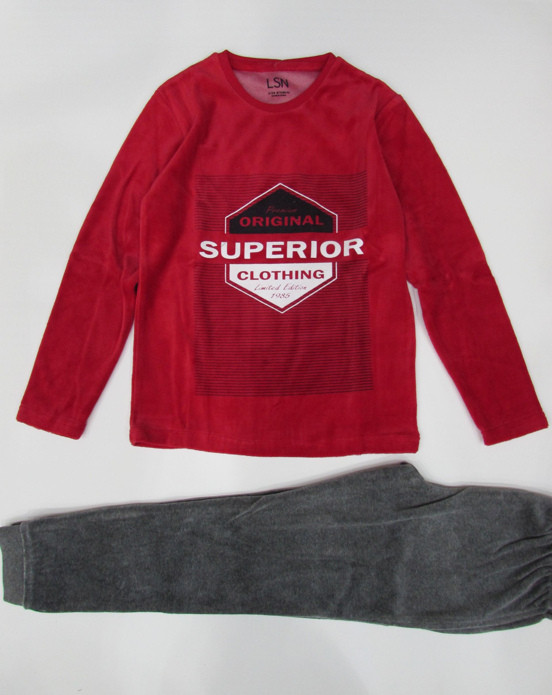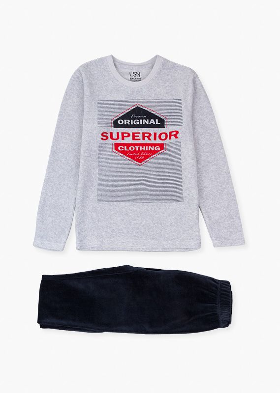 Pijama de terciopelo largo para chico. Camiseta con cuello redondo en tejido de canalé. Estampado delantero. Pantalón largo con cintura elástica. Puños en tejido de canalé. Servido en bolsa del mismo tejido. Disponible en varios colores.