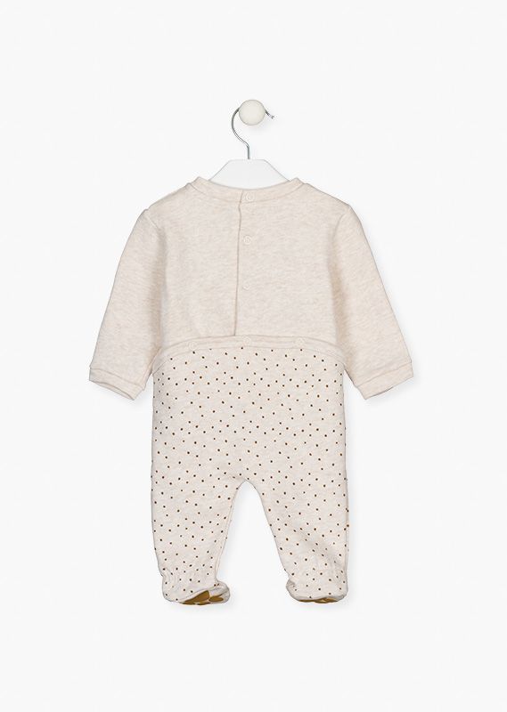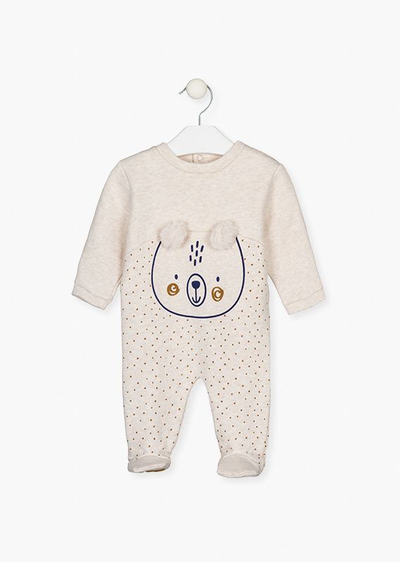 Pijama en felpa perchada para recién nacido. Pijama en color crudo estampado de bolitos. De manga larga y cuello caja. Con bordado de cara de oso en el delantero. Con abertura en espalda y trasero con automáticos. Con huella estampada antideslizante en la suela.