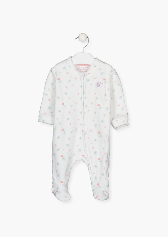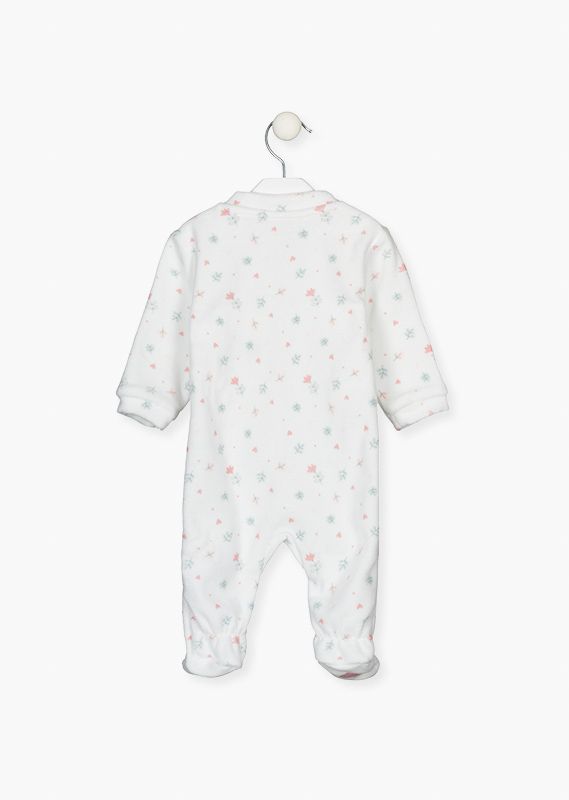 Pijama estampado con cremallera para recién nacida. Pijama de terciopelo de manga larga en color crudo con flores estampadas. Con abertura delantera con cremallera. Suela con corazón estampado antideslizante.
