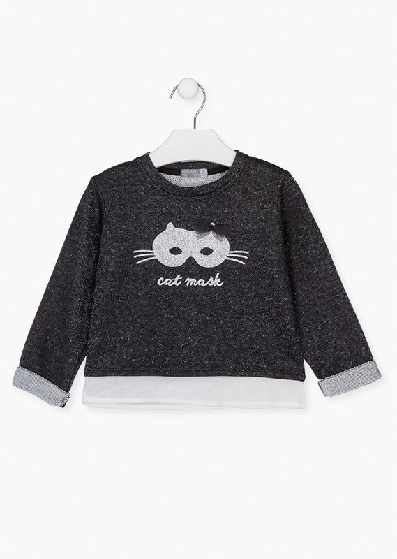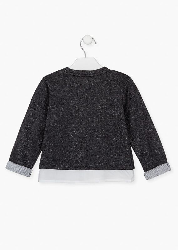 Sudadera combinada con brillantina en delantero para niña. Sudadera de felpa no perchada con parte superior de color negro con detalles de hilo de lurex y parte inferior simulando camisa de color natural. Con vuelta en puños.