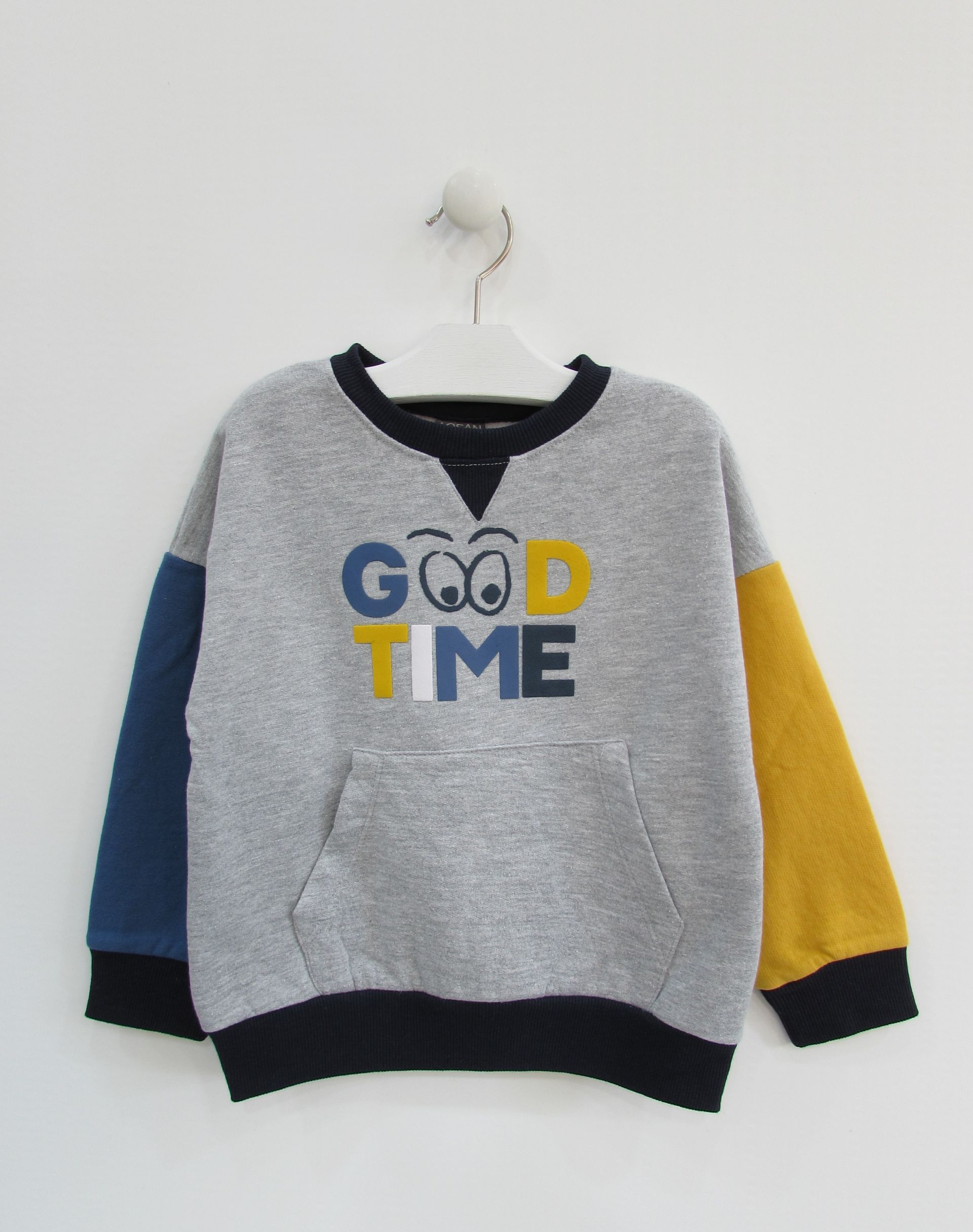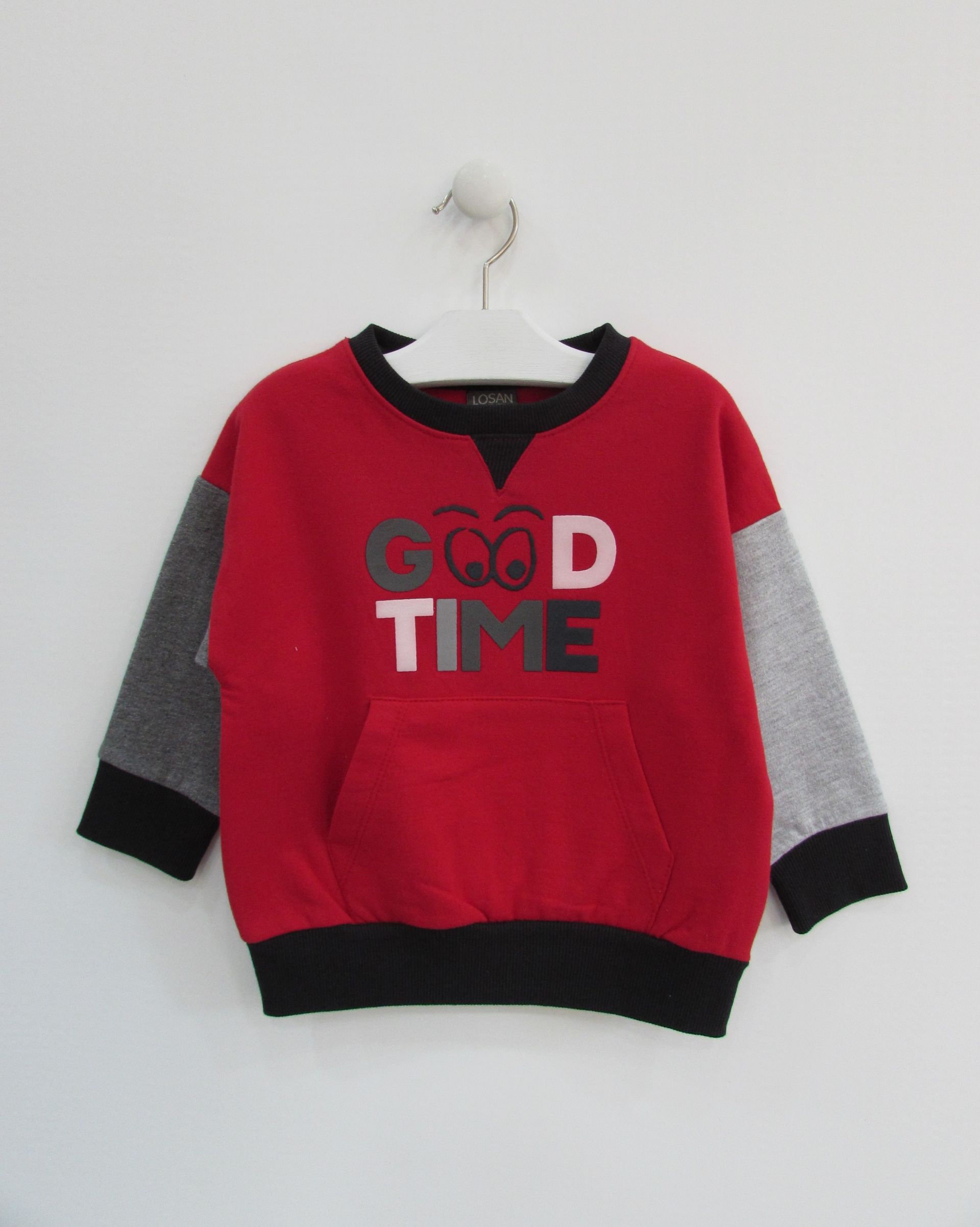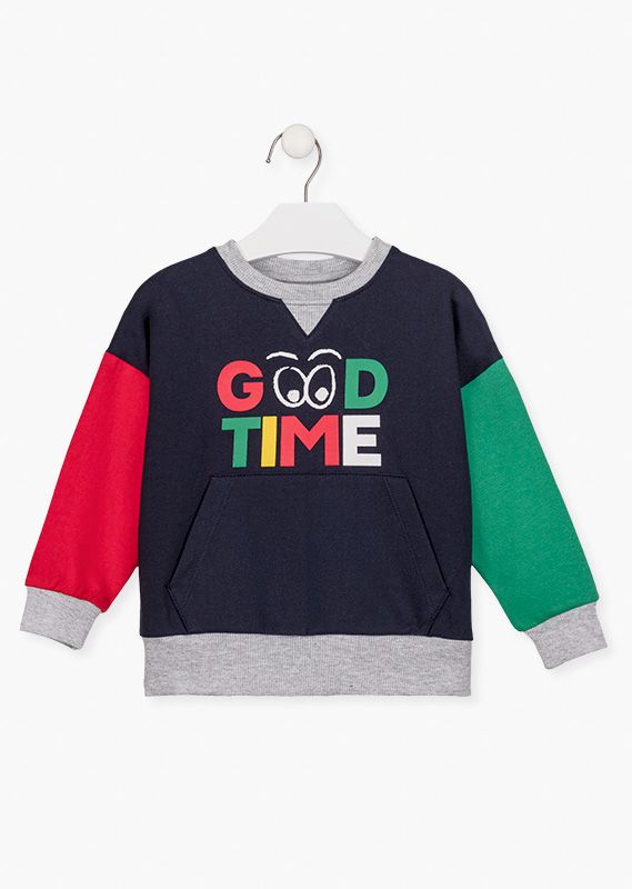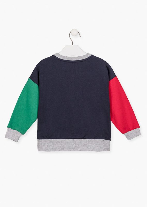 Sudadera con bolsillo canguro y estampado engomado para niño. Sudadera de felpa perchada con mangas a contraste. Con tejido de canalé en el cuello con detalle de pico, en puños y bajos. Disponible en marino, gris y rojo.