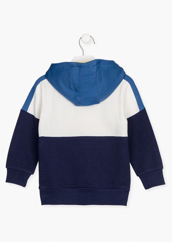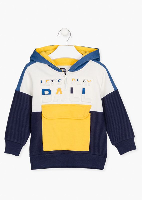Sudadera con bolsillo con solapa en delantero para niño. Sudadera en tejido de felpa perchada con capucha forrada en tejido de punto a contraste. Con estampado en pecho y media cremallera en delantero.