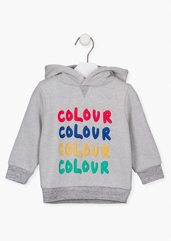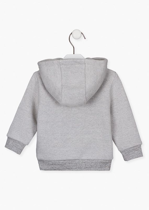 Sudadera con capucha y puños para bebé niño. Sudadera de felpa perchada con estampado engomado en el delantero. En color gris con puños en bajos y mangas. Con cubrecosturas en el interior del cuello.