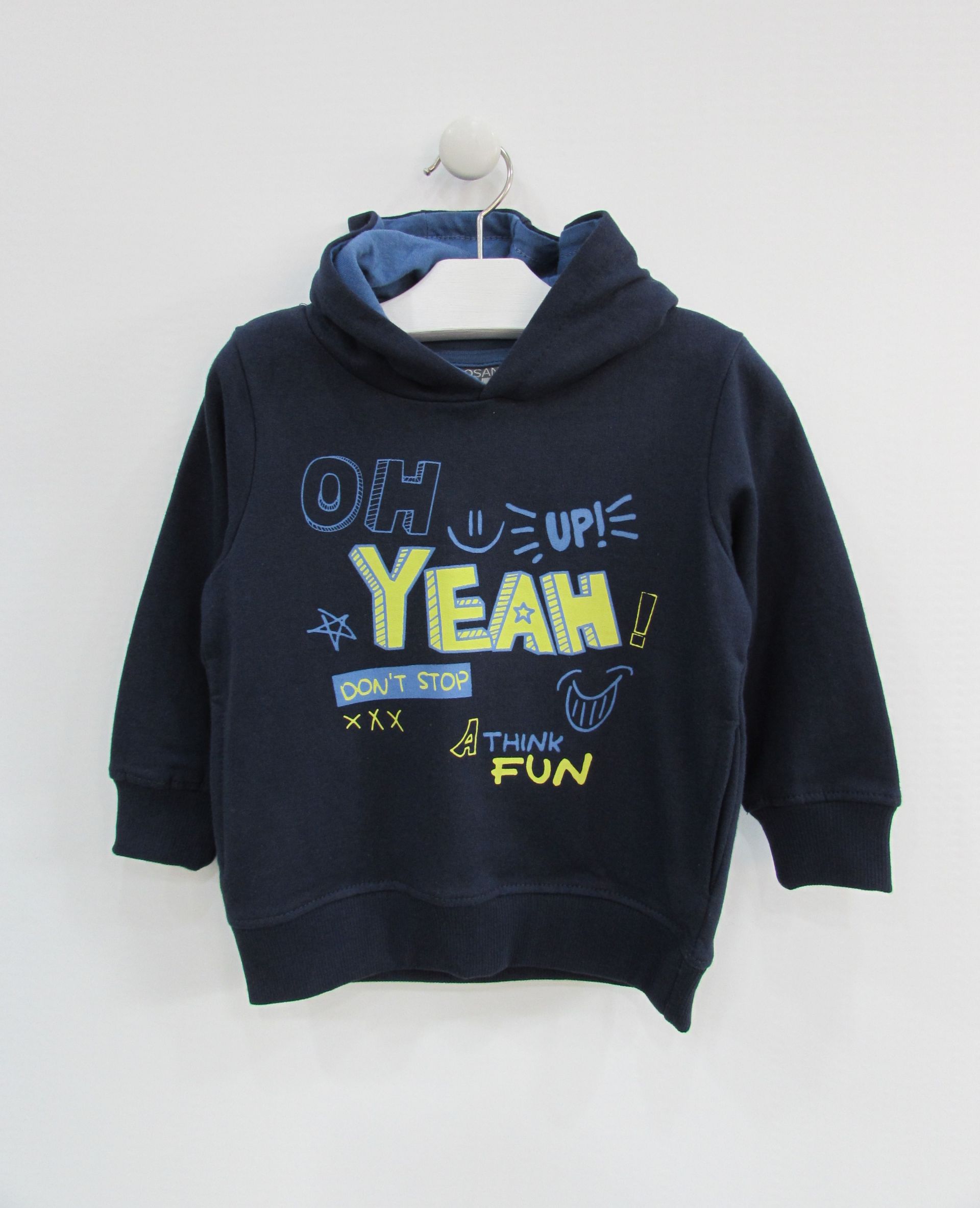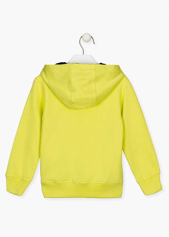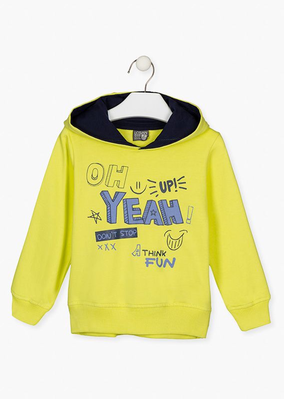 Sudadera con mensaje y capucha para niño. Sudadera en tejido de algodón con terminaciones en canalé. Capucha con forro de punto. Disponible en pistacho y azul marino.