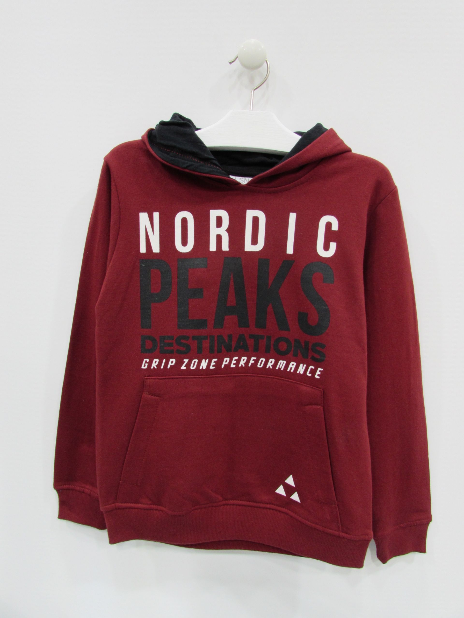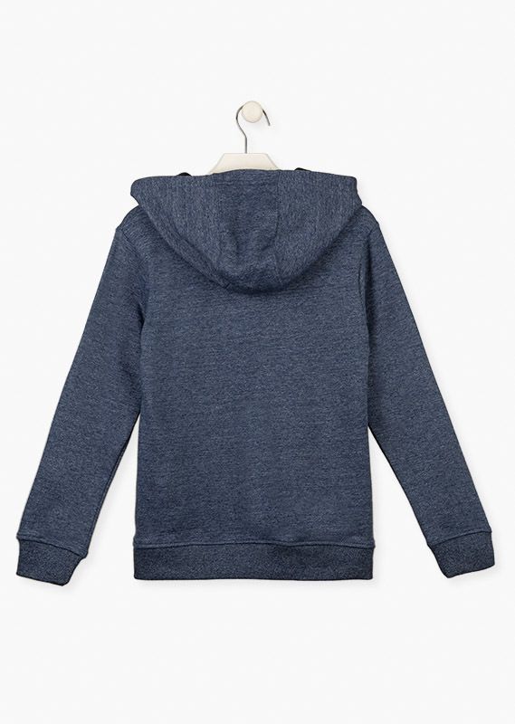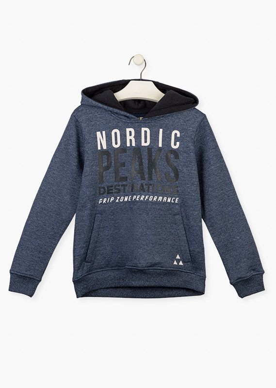 Sudadera de felpa con bolsillo canguro para chico. Sudadera en tejido de algodón. Con capucha. Mensaje en el delantero. Terminaciones de canalé. Disponible en azul y granate.