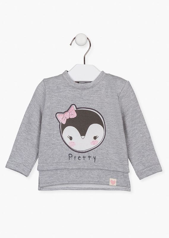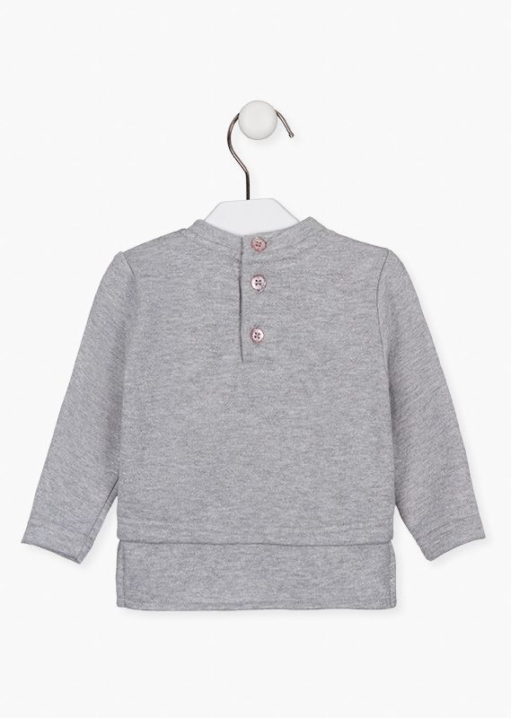 Sudadera de felpa con hilo brillante para bebé niña. Sudadera cuello caja con parche bordado y estampado con purpurina en el pecho. Con bajo desigual imitando dos prendas. Con aberturas laterales en el bajo. Con cubrecosturas en el cuello. Con abertura en la parte superior de la espalda con botones brillantes.