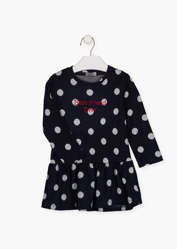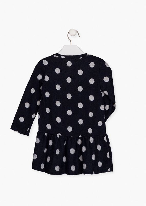 Vestido estampado con bolitos para niña. Vestido manga larga y cuello redondo en tejido de punto lanoso en color azul marino. Con corte en cintura y falda con vuelo. Con bordado en pecho de hilo de lurex.